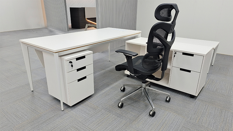 De mobiele zijkast met lade en open planken die aan dit managerbureau zijn bevestigd, kunnen onafhankelijk worden gebruikt en aan de linker- of rechterkant worden geïnstalleerd, afhankelijk van uw gewoonten. De vier wielen van de kast kunnen uw verhuizing gemakkelijker maken. De archieflade is geschikt om uw briefformaat archief op te hangen. De kast is gemaakt van hoogwaardig E1-spaanplaat dat waterbestendig en gemakkelijk schoon te maken is.