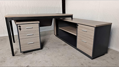 Met zijn strakke en stijlvolle design is dit L-vormige bureau het perfecte middelpunt voor uw kantoor of thuiswerkplek. Doe uw werk comfortabel en stijlvol met dit prachtige en functionele bureau.
