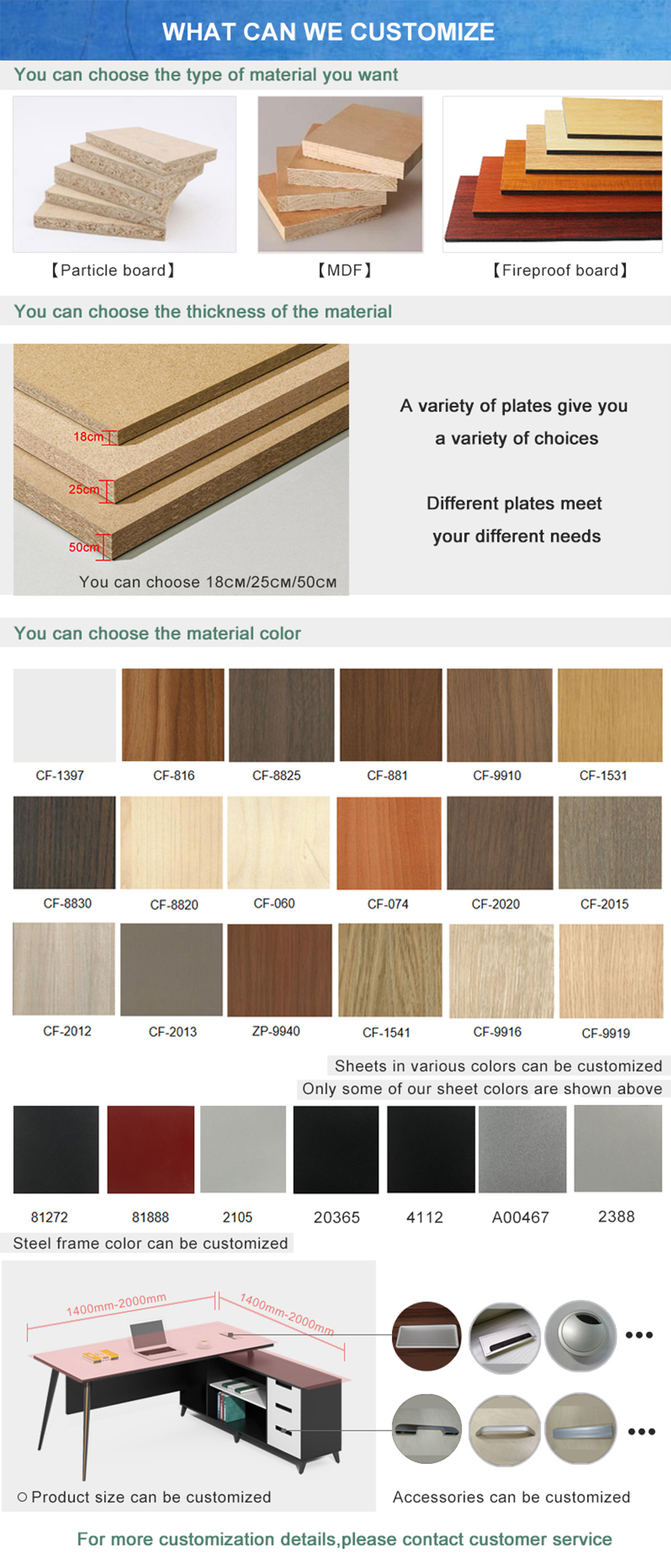 Guangzhou Xusheng Furniture Co., Ltd. is gevestigd in Guangzhou Zengcheng District, Guangzhou City, en geniet van handig vervoer en een prachtige omgeving. Met meer dan 12 jaar ervaring in de kantoormeubelindustrie. Wij zijn gespecialiseerd in kantoormeubelen. Onze fabriek heeft een rijke ervaring in de kantoormeubelindustrie. Daarnaast hebben we ISO14001- en ISO9001-certificaten behaald. De belangrijkste producten van onze fabriek zijn onder meer bureaus, kantoortafels, directiebureaus, personeelsbureaus, kantoorwerkplekken, computerbureaus, archiefkasten, vergadertafels, hotelmeubels, enz. Bovendien doen we er alles aan om nieuwe producten te ontwikkelen die aan verschillende vereisten voldoen. Onze fabriek heeft een eigen grote productielijn, beheerd door een team van jarenlange ervaring, leiders en professionele ontwerpers. Door ons te houden aan het bedrijfsprincipe van wederzijdse voordelen, hebben we een goede reputatie onder onze klanten vanwege onze perfecte diensten, kwaliteitsproducten en concurrerende prijzen. Onze producten worden goed verkocht in alle steden en provincies in China en worden ook geëxporteerd naar klanten in landen en regio's zoals Zuidoost-Azië, Europa, Amerika, het Midden-Oosten en Afrika. We verwelkomen ook OEM- en ODM-bestellingen. Of u nu een actueel product uit onze catalogus selecteert of technische ondersteuning zoekt voor uw toepassing, u kunt met ons klantenservicecentrum praten over uw inkoopvereisten. Als u nieuwe ideeën of concepten voor de producten hebt, neem dan contact met ons op.